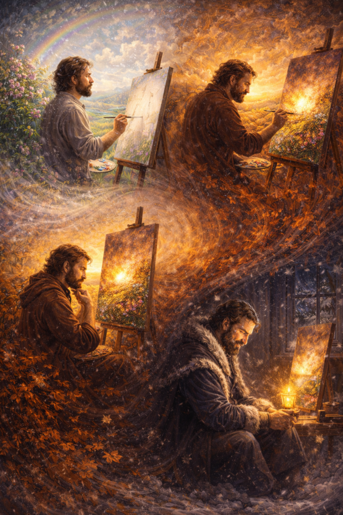 Wer die Prinzipien von Leben, Herbst, Winter und Tod versteht, kann mit innerer Ruhe und Klarheit am Ende seines individuellen Zyklus stehen, ohne Furcht, ohne Drängen, sondern im Wissen, dass das Schwingen weitergeht, in Form, Gestalt oder Impuls, jenseits der eigenen spezifischen Existenz.