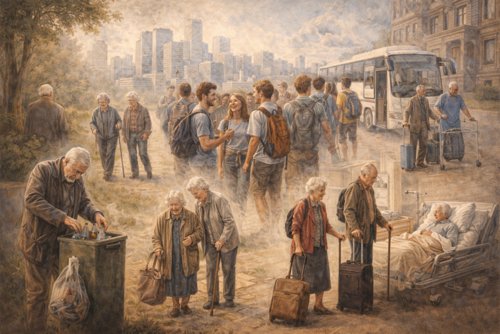 Gesellschaften lassen sich ebenfalls als schwingende Systeme betrachten. Sie durchlaufen Aufstieg, Blüte, Stabilität, Erstarrung und Zerfall. In modernen Industrieländern wird oft nur die Hochphase – Expansion, Wachstum, Leistung – sichtbar gefördert, während Rückzug, Alter und Tod verdrängt werden.
