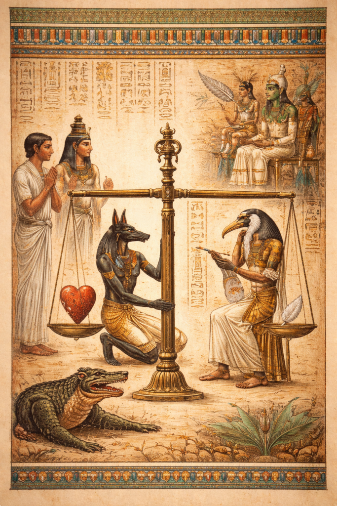 In der altägyptischen Kultur war das Leben stets eingebettet in einen zyklischen Kosmos, in dem Tod und Weiterleben untrennbar miteinander verbunden waren. Leben wurde nicht als Selbstzweck betrachtet, sondern als Vorbereitung auf ein Weiterleben nach dem Tod. Der Körper und das Herz wurden als zentrale Elemente der Existenz angesehen, die in das Urteil des Jenseits einflossen. Die berühmte Waage der Maat, auf der das Herz gegen die Feder des Maßes gewogen wurde, symbolisierte ein frühes Bewusstsein für innere Ordnung und Ausgleich. Tod war kein endgültiges Ende, sondern ein Übergang, der von der inneren Ordnung, von Maßhalten und stimmiger Lebensführung abhängen konnte. Die ägyptische Kultur zeigt, dass das Bewusstsein über den Kreislauf des Lebens bereits in frühen Hochkulturen ausgeprägt war und den Tod in den Kontext eines umfassenden Lebenszyklus stellte.
