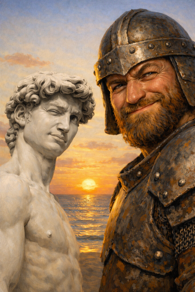Das Titelbild zeigt Michelangelos David, vollständig in seiner kontrapunktischen Haltung, Standbein und Spielbein ausbalanciert Doch das Bild erzählt mehr als Anatomie und Form: Es ist ein Spiegel innerer Haltung und Entscheidungskraft.