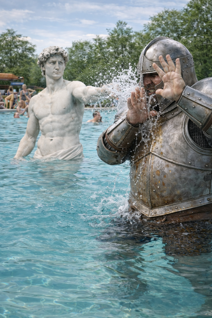 Der Stein in seiner Hand ist dabei nicht Ausdruck von roher Gewalt, sondern Symbol für Fokus, Verdichtung, klare Entscheidung und präzise Handlung. Er bündelt Spannung, kanalisiert sie, wird zu einem einzigen, gerichteten Impuls gegen die diffuse Übermacht.