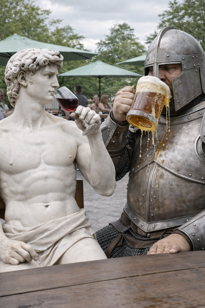 In der Bibelgeschichte (1. Samuel 17) steht David vor Goliath, dem Sinnbild der Übermacht: der eingeschüchterten Masse, äußerer Autorität, der scheinbar objektiven Bedrohung. Er repräsentiert das Laut- und Größere, das Quantitative, die diffuse Angst, die kollektive Lähmung, das „Das schaffe ich nie“.